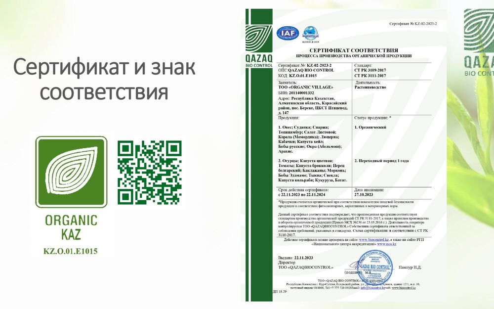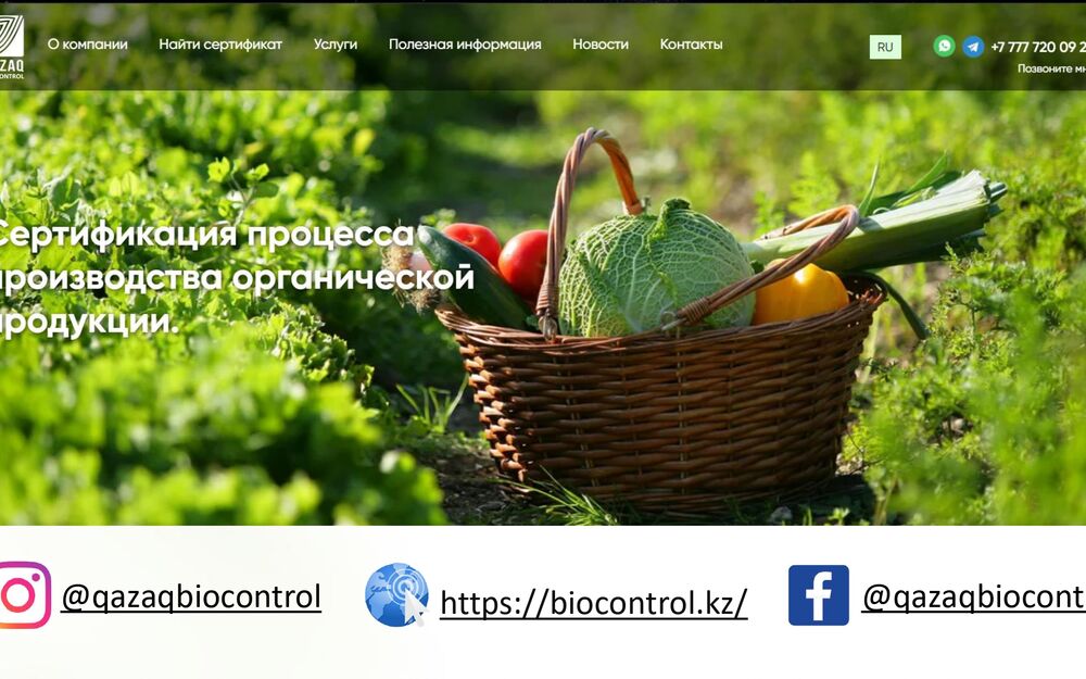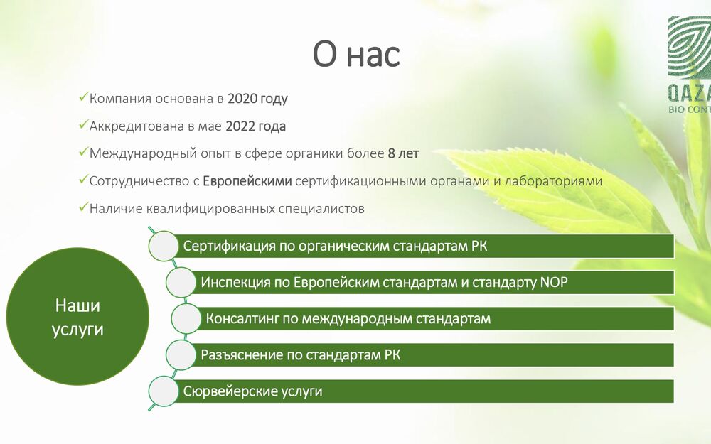 Мы открыли компанию «QazaqBioControl», чтобы дать уверенность в качестве органических продуктов, их безопасности и соответствии маркировке, обеспечив соблюдение необходимых требований и стандартов производства.