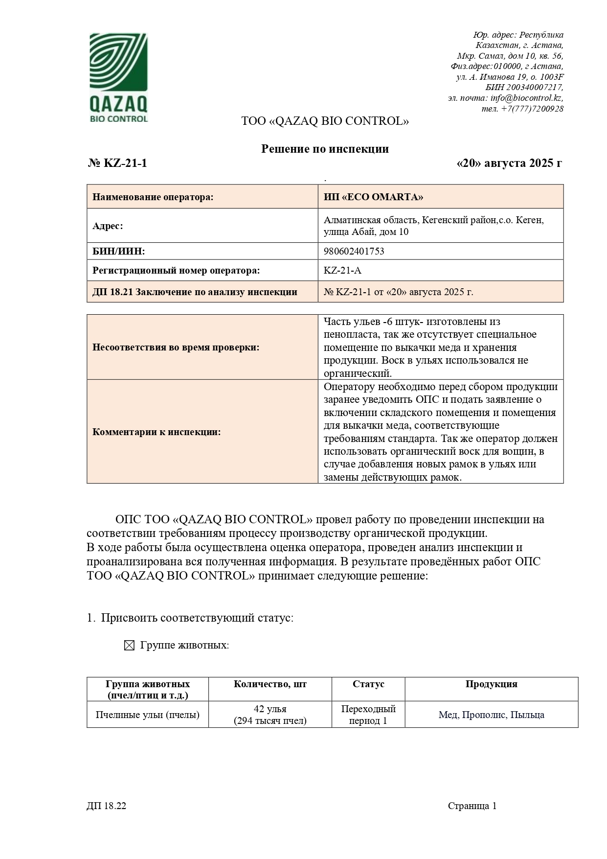 Решение о присвоении статуса № ИП "ECO OMARTA"