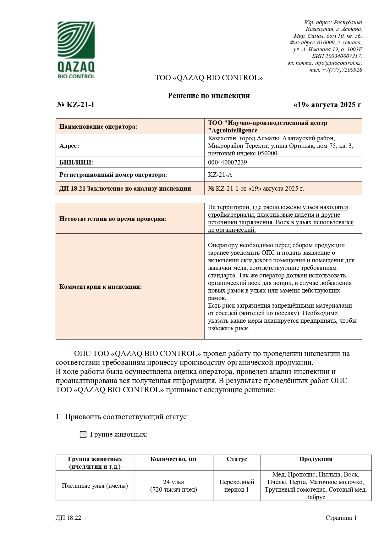 Решение о присвоении статуса ТОО "Научно-производственный центр "Agrointelligence”
