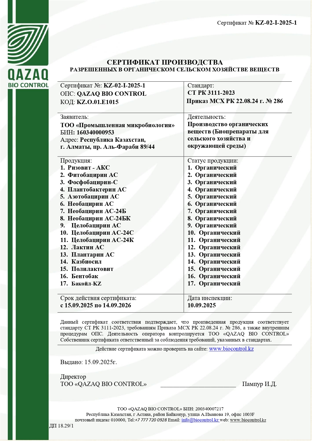 Сертификат соответствия № KZ-02-I-2024-1